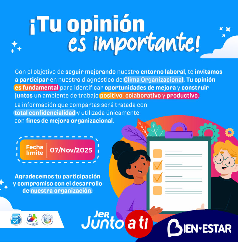 Por eso, te invitamos a participar en el Diagnóstico de Clima Organizacional , una herramienta clave para seguir construyendo un entorno de trabajo positivo, colaborativo y enfocado en el bienestar de todos.
